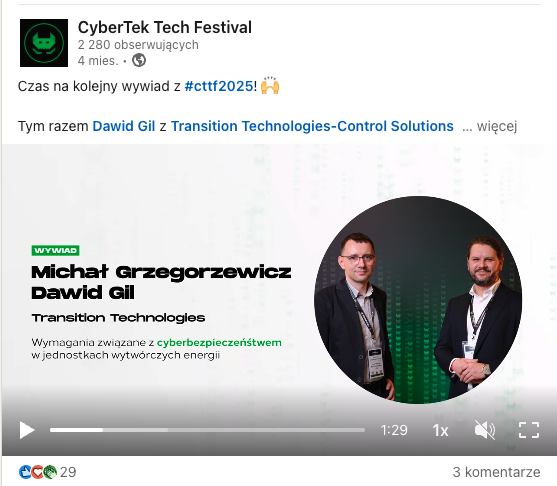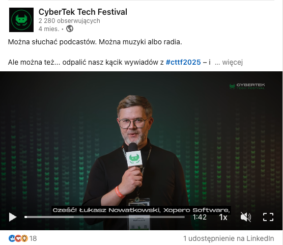 Dzięki serii wywiadów CyberTek Tech Festival 2025 funkcjonuje w komunikacji długo po zakończeniu samego wydarzenia. Materiały są regularnie publikowane w mediach społecznościowych, przyciągając uwagę partnerów, ich odbiorców oraz osób zainteresowanych tematyką cyberbezpieczeństwa.